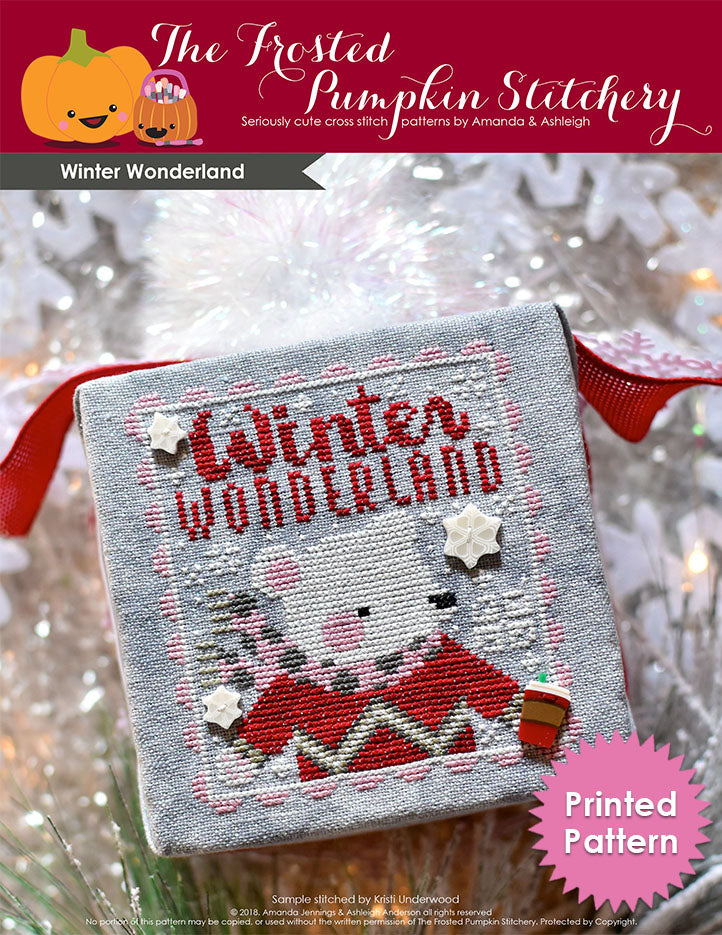 Winter Wonderland counted cross stitch pattern has a cuddly polar bear out for an afternoon stroll in the snow with a large latte cup. He's wearing his favorite pink and gray polka dot scarf and red chevron striped sweater. To make this pattern extra adorable, we've added buttons from Just Another Button Company.