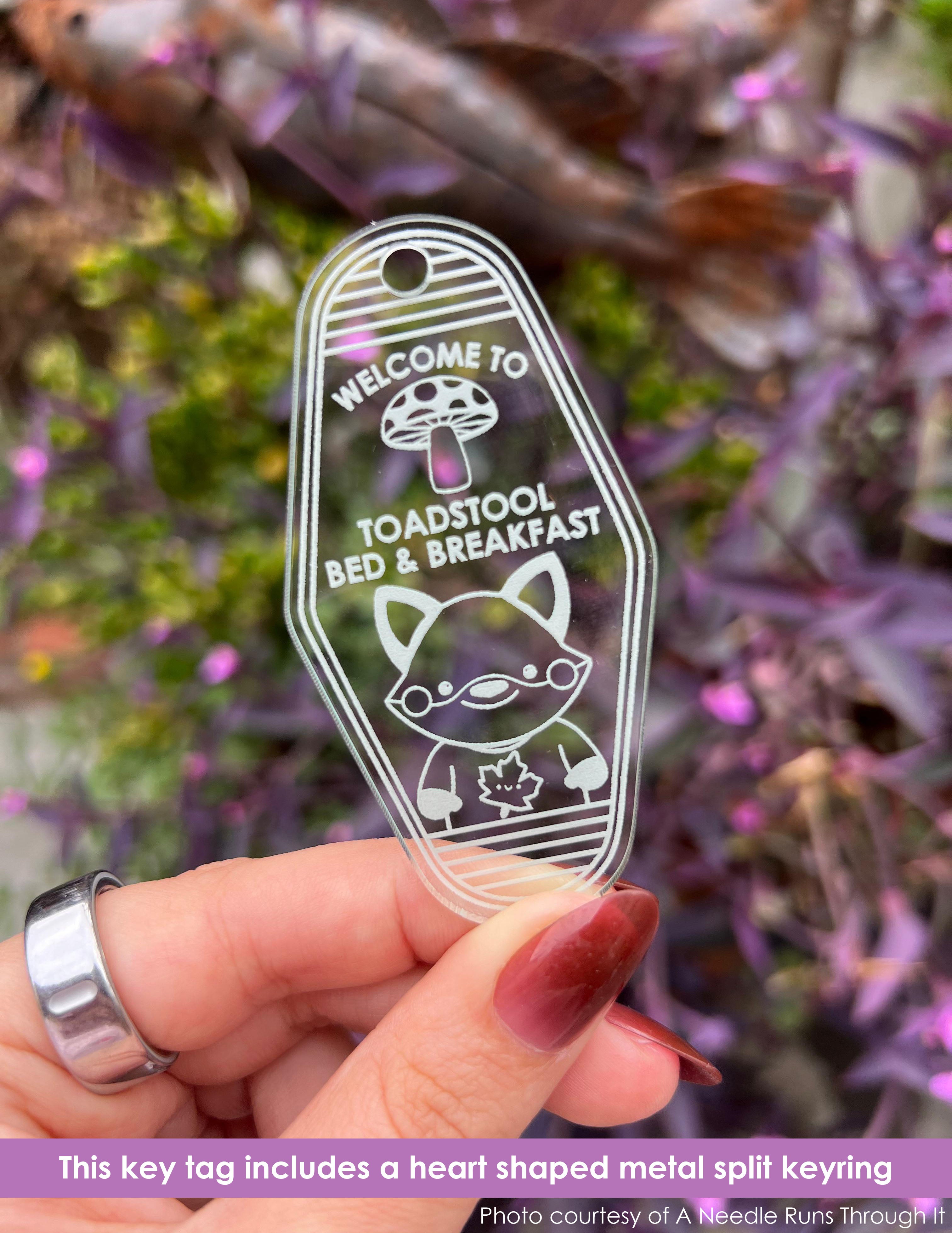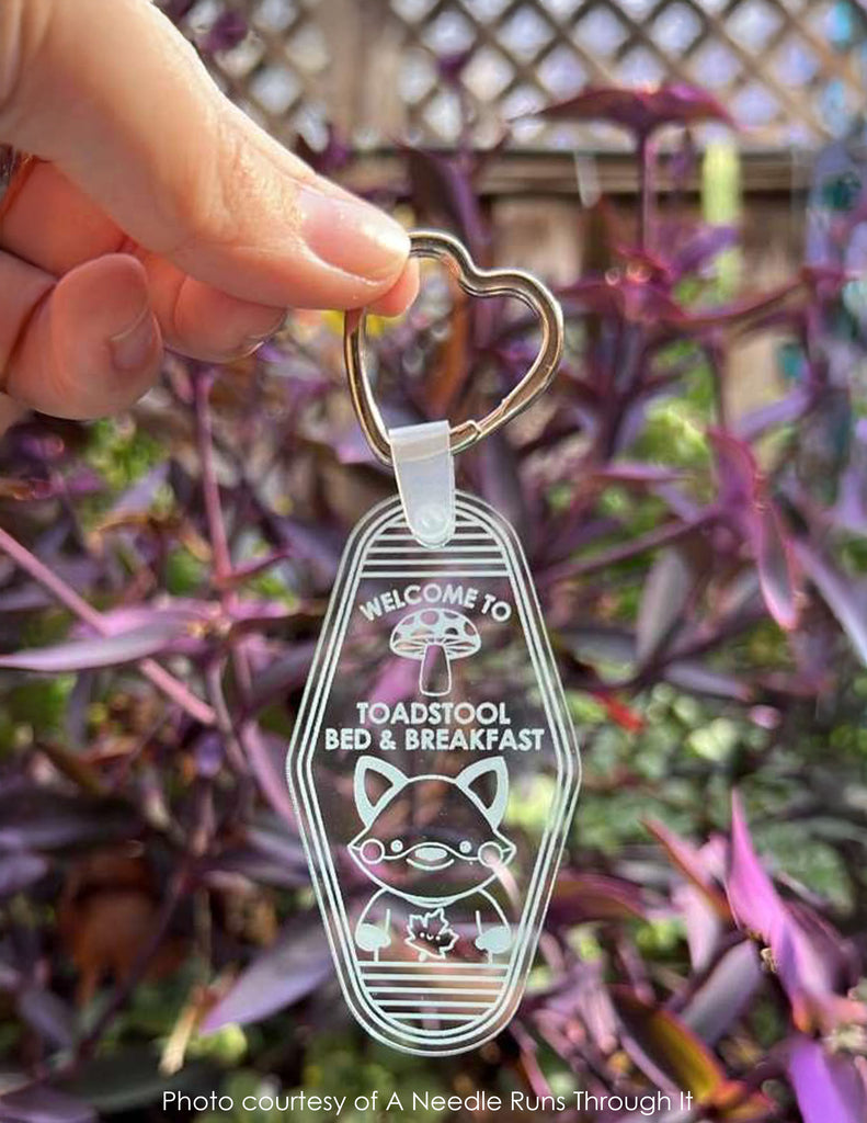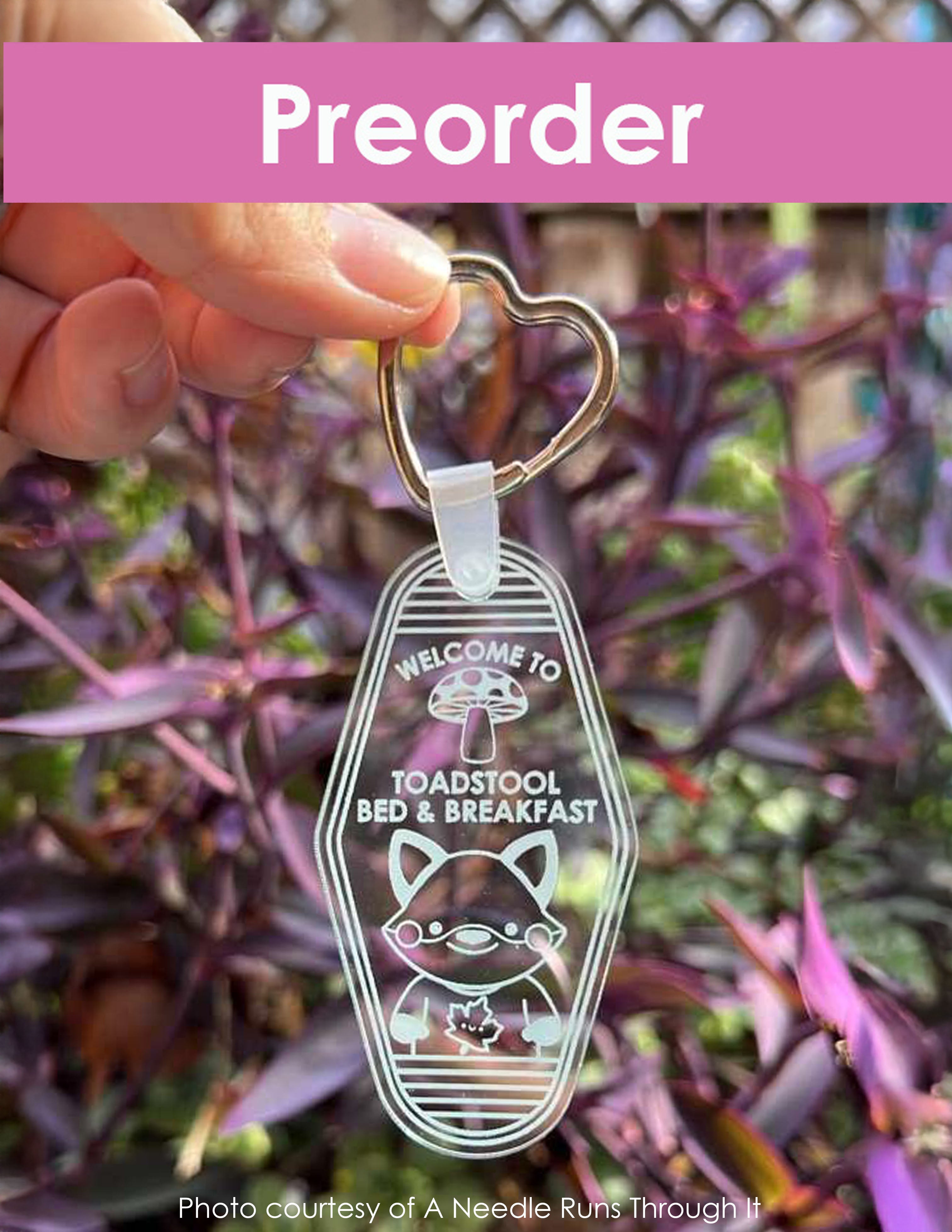 One of Finnegan's favorite projects for the Toadstool Bed & Breakfast was designing the B&B's key tags! This clear version features Finnegan in his favorite fall shirt. This tag can be added to your favorite project bag for some extra cuteness!